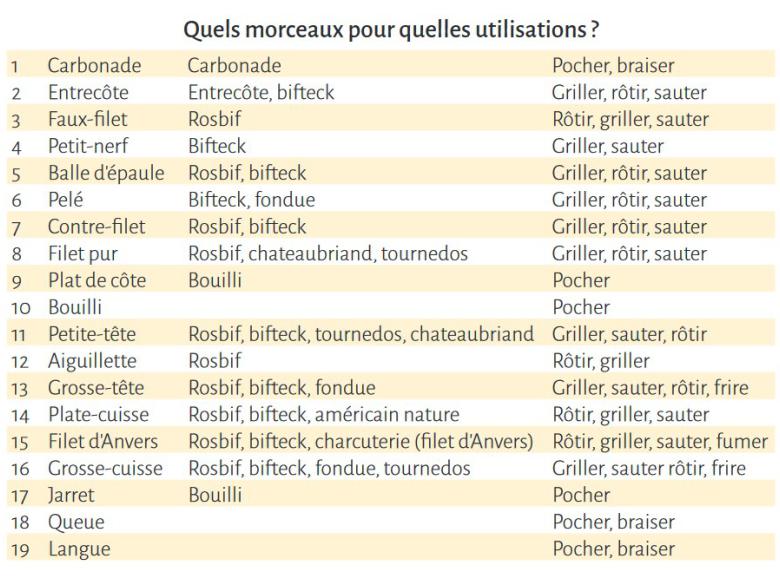 La viande de Blanc-Bleu Belge offre un large éventail de morceaux, de formes, de textures et de goûts différents qui permettent de varier les plaisirs. En sauce, rôtie, grillée, braisée, hachée, ou même crue, la viande de Blanc-Bleu Belge peut être déclinée de 1001 façons. Le choix des morceaux de viande se fait en fonction du plat à préparer.